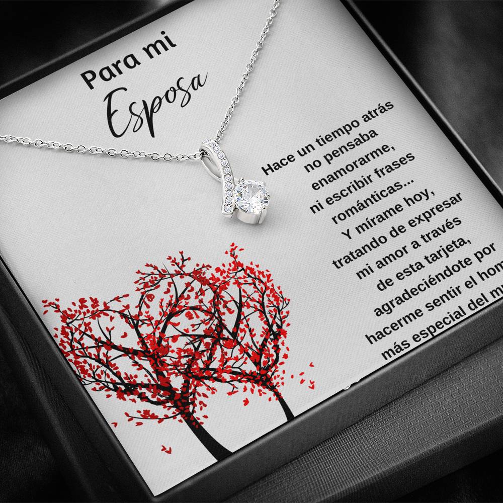 Melt her heart with this ALLURING BEAUTY necklace gift! The petite ribbon shaped pendant is finished with 14K white gold over stainless steel, and is embellished with dainty clear crystals surrounded by a sparkling 7mm round cut Cubic Zirconia.