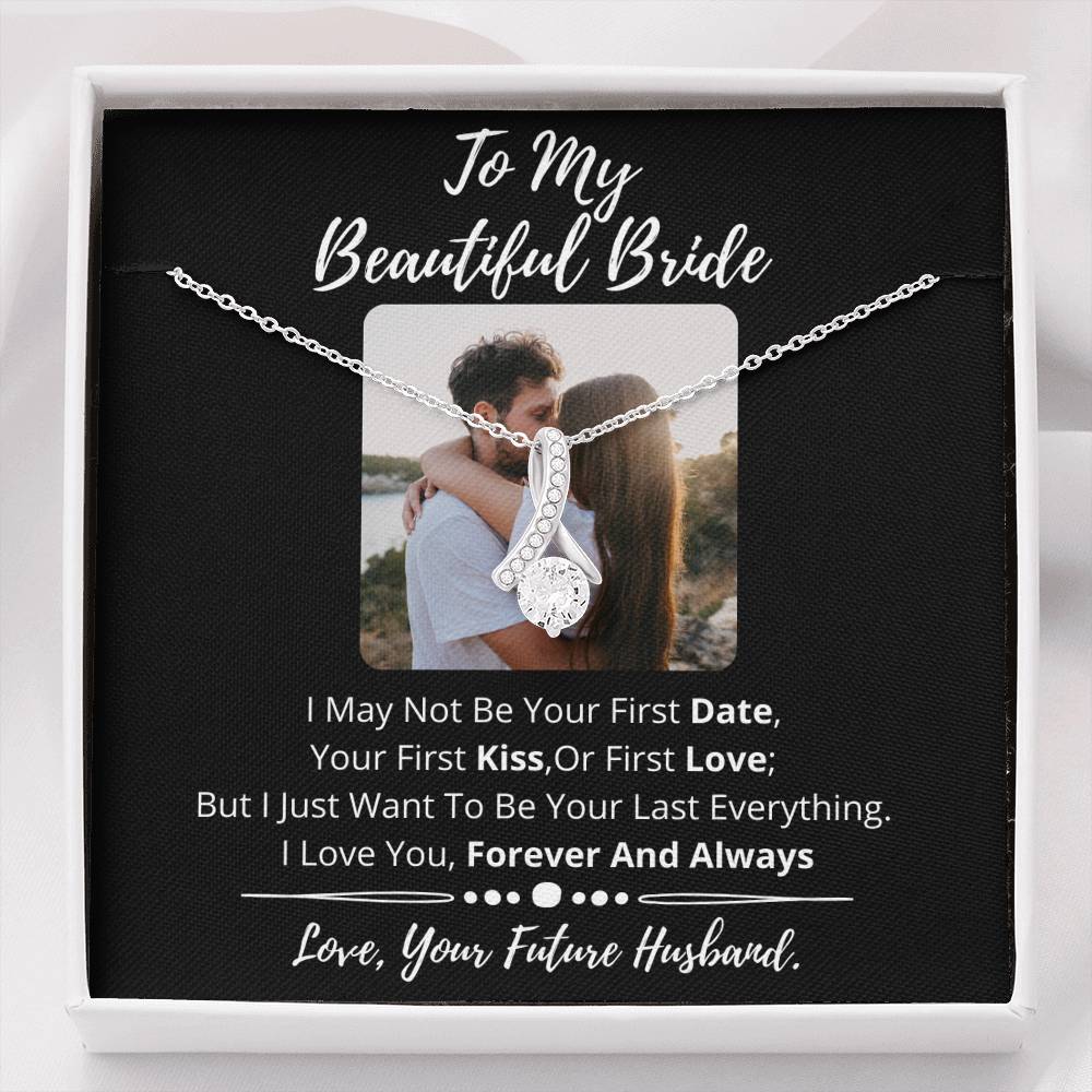 Melt her heart with this ALLURING BEAUTY necklace gift! The petite ribbon shaped pendant is finished with 14K white gold over stainless steel, and is embellished with dainty clear crystals surrounded by a sparkling 7mm round cut Cubic Zirconia.